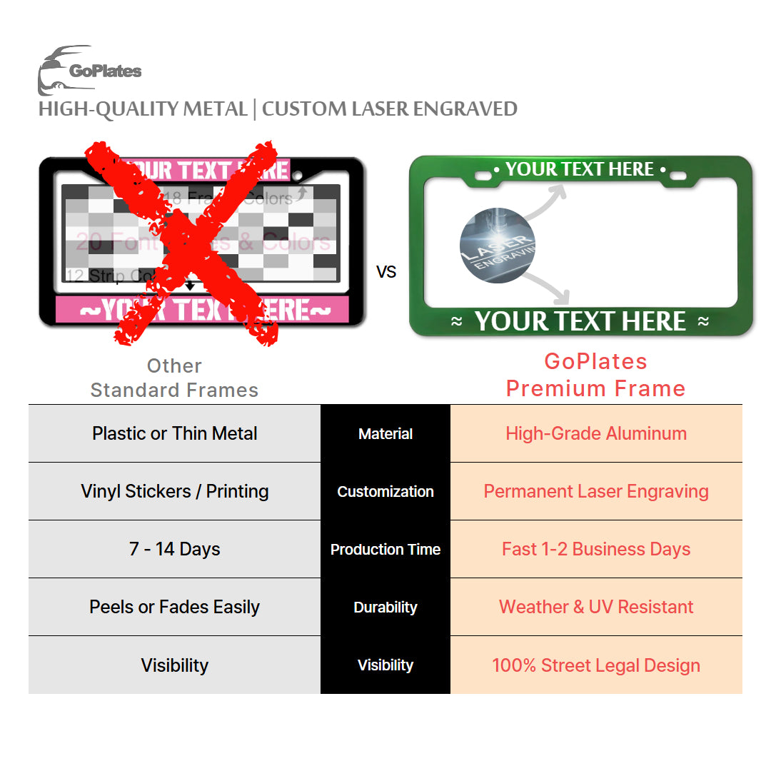 Stop settling for flimsy dealer frames and vinyl stickers that fade in the sun. GoPlates gives you a professional‑grade license plate frame that combines aerospace‑grade aluminum with your unique personality. Whether it’s your social handle, business name, or a sentimental message, we laser engrave it to look sharp for years.